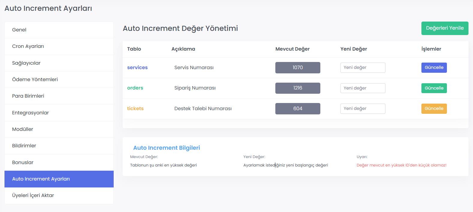 Auto Increment Değer Yönetimi Modülü (Yeni): Artık Servis Numarası, Sipariş Numarası ve Destek Talebi Numarası başlangıç değerleri admin paneli üzerinden manuel olarak ayarlanabiliyor.Görsel İncele